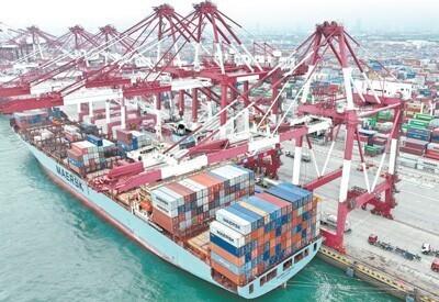 日前,在青岛港前湾码头,货轮正在装卸集装箱。