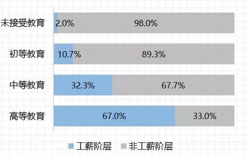 报告显示,受过高等教育的人中,近7成为工薪人群,远高于非工薪人群。