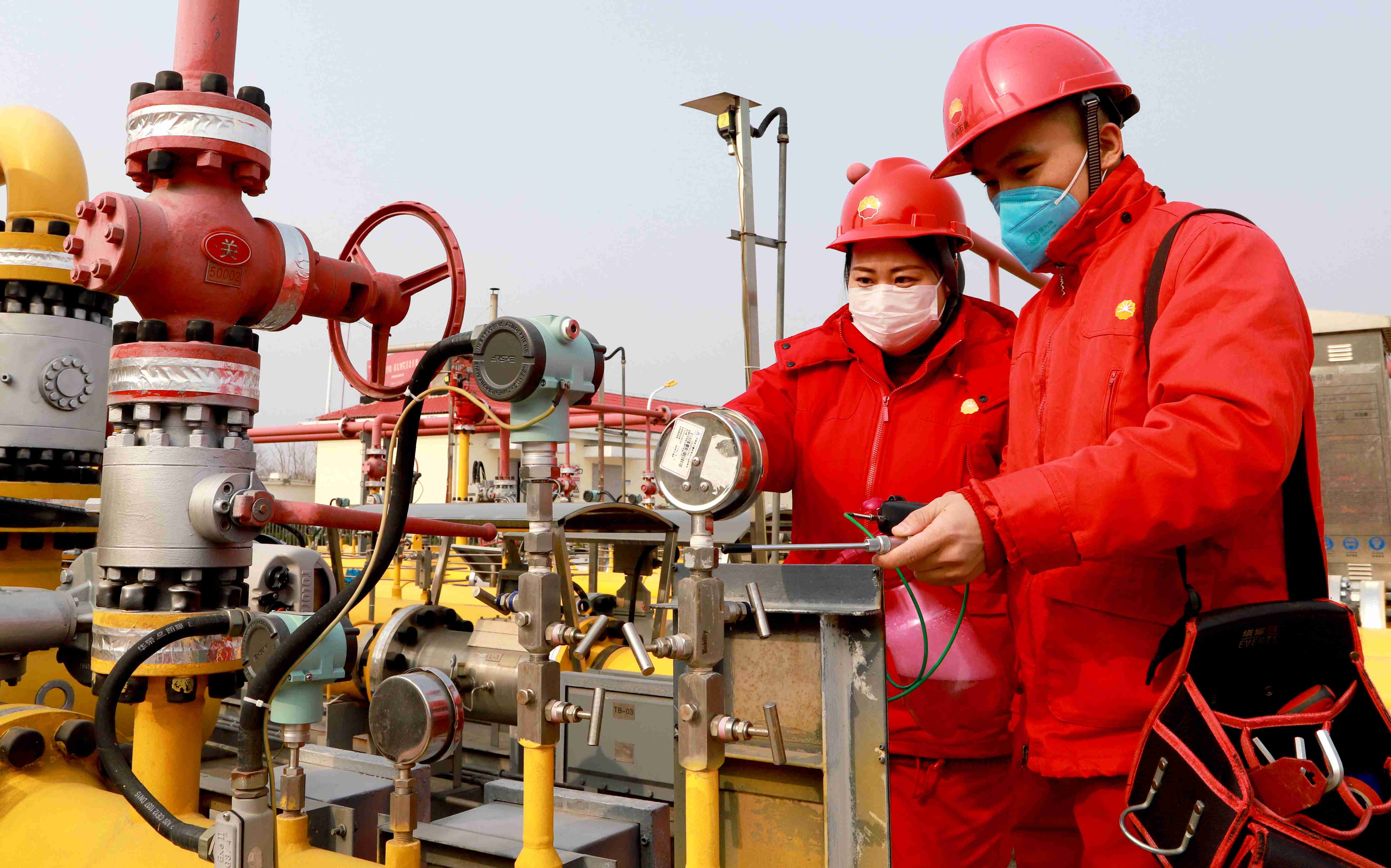 图为今年年初疫情期间河南分公司员工在生产现场加密巡检,确保安全生产。