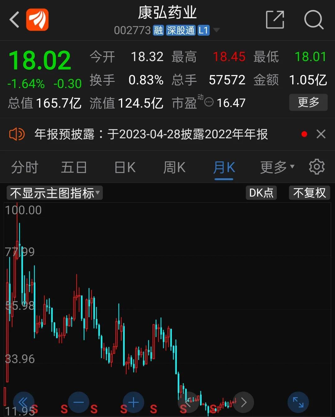 2017年4月份,康弘药业的股价从100元的高价跌倒了40几元,股价跌去了50%以上。