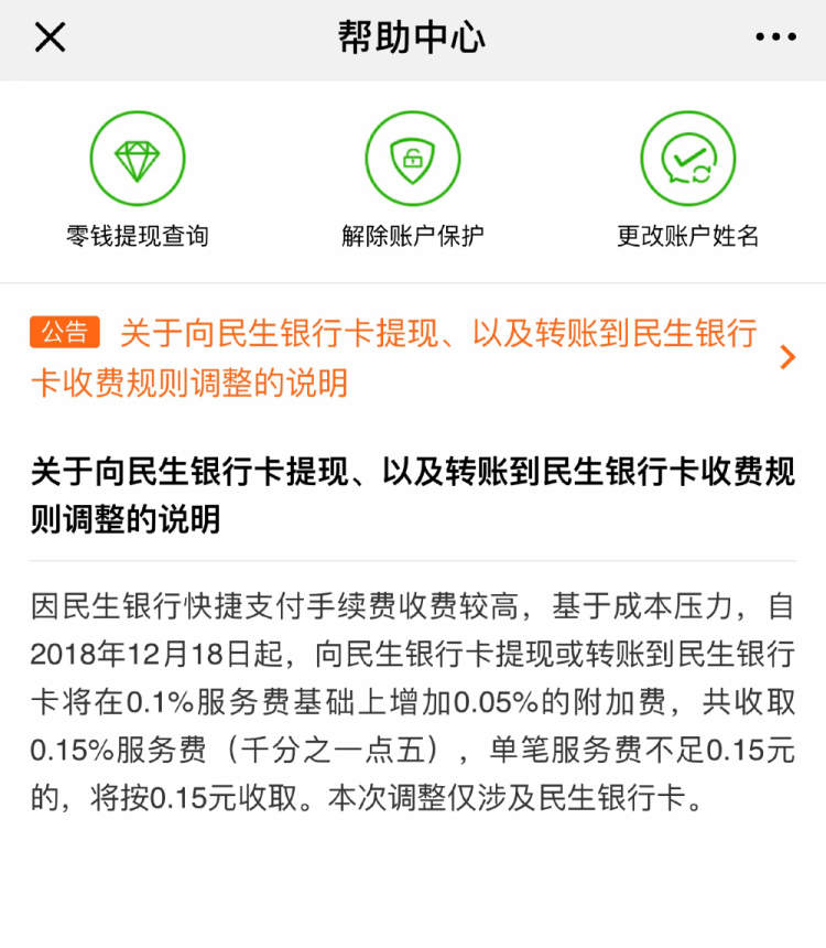 11月18日,微信发布公告称,由于民生银行快捷支付手续费高,单独调整其提现手续费至0.15%。