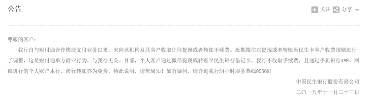 公告中称,自与财付通合作快捷支付业务以来,未向该机构及其客户收取任何提现或者转账手续费。近期微信对提现或者转账至民生卡客户收费规则进行了调整,这是财付通单方商业行为,与我行无关。目前,个人客户通过微信提现或转账至民生银行借记卡不收取手续费,且通过手机银行APP、网银进行的个人账户本行、跨行转账亦为免费。
