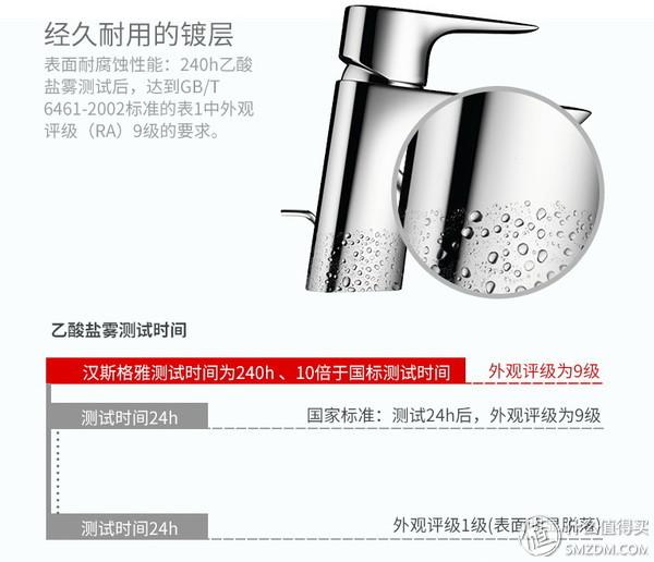 汉斯格雅:240小时测试时间,10倍国标测试标准,评级为9级,很直观很详细地告诉消费者。