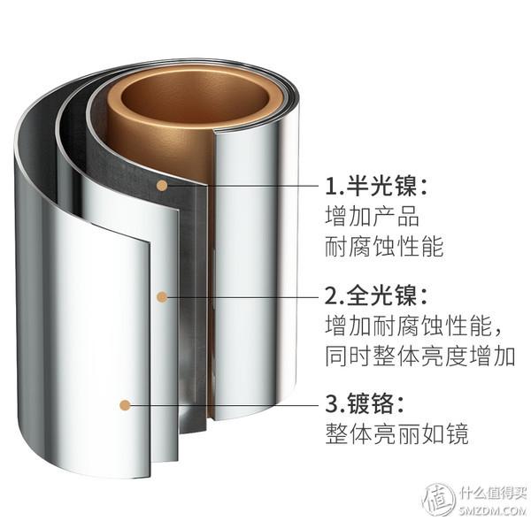 镍层(包括半光镍和光亮镍)起到了抗腐蚀的作用。而由于镍本身材质较软且颜色发暗,因此,会在镍层上再镀一层铬层,起到硬化表面同时提高亮度的作用。