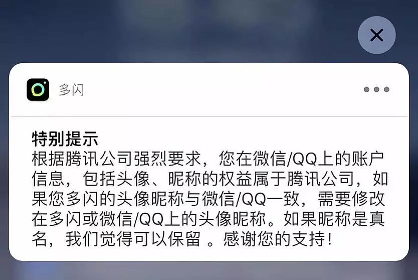 昨天下午,多闪APP向用户发送弹窗消息称:由于腾讯方面的要求,希望用户修改在多闪或者微信上的账户头像与昵称。