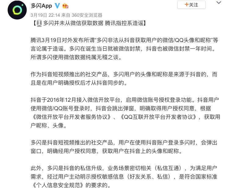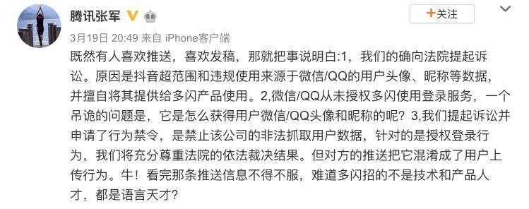 同时,张军在微博中还附上了腾讯方面回应:关于某APP弹窗推送的信息,纯属偷换概念的无稽之谈。腾讯还称,抖音违反相关协议、商业道德和法律,将来源于微信和QQ头像、昵称等数据提供给多闪使用。