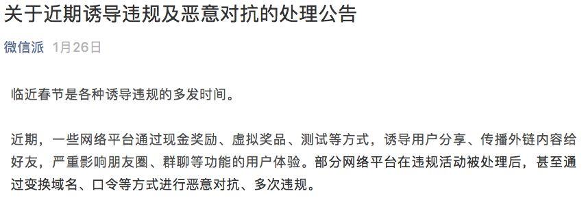 1月26日,微信官方发布了《关于近期诱导违规及恶意对抗的处理公告》:近期一些网络平台通过现金奖励、虚拟奖品、测试等方式,诱导用户分享、传播外链内容给好友,严重影响朋友圈、群聊等功能的用户体验。