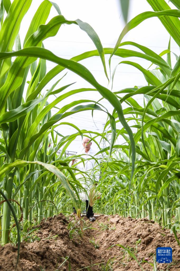 玉米育种专家程相文在海南三亚南繁科研育种基地观察玉米生长情况(2022年12月15日摄)。新华社记者 张丽芸 摄