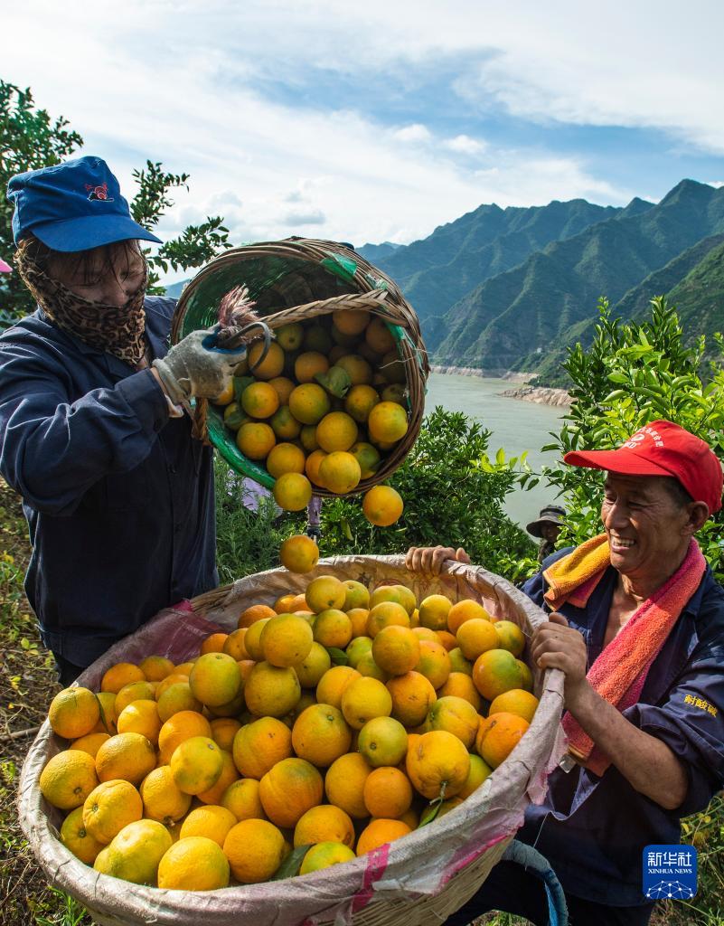 湖北省宜昌市秭归县沙镇溪镇台子湾村村民在柑橘园里转运夏橙(2022年6月21日摄)。新华社发(郑家裕 摄)