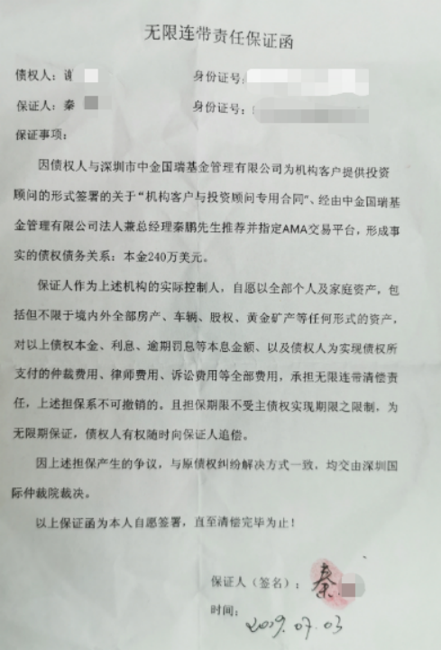 “如果秦某仅仅只是AMA平台的投资者,他完全没有必要承担无限连带责任,而且他也是受害者,中金国瑞的大量投资款也转去了AMA,应该马上报警。”有投资者表示,但蹊跷的是,他没有这样做,反而是向谢先生这样的专户投资者们写下了无限连带责任保证函。