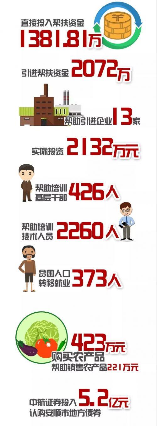过去一年能取得这样的成绩,是以习近平同志为核心的党中央坚强领导、对贵州关怀厚爱的结果,也是贵公司等中央定点扶贫单位对我省鼎力支持、全力相助的结果。2018年,贵公司在开展对我省安顺市镇宁县、普定县、关岭县、紫云县的定点扶贫工作中,谭瑞松董事长率先垂范,亲赴帮扶县开展帮扶工作。贵公司还先后组织工作调研组370人次深入帮扶县实地调研,选派12名干部蹲点挂职,指导帮扶县开展脱贫攻坚工作,推动帮扶政策、资金、项目等精准地向贫困村和贫困人口倾斜。同时,直接投入帮扶资金1381.81万元,引进帮扶资金2072万元;帮助引进企业13家,企业实际投资2132万元;帮助培训基层干部426人,培训技术人员2260人,培训贫困人口438人;帮助贫困人口实现转移就业373人;购买农产品423万元,帮助销售农产品221万元。此外,贵公司在帮扶工作中,按照中国银监会金融扶贫政策,由所属中航证券投入5.2亿元认购安顺市地方债券,支援地方脱贫攻坚工作。贵公司一年来卓有成效的帮扶工作,有力推动帮扶县脱贫攻坚取得显著成效。在此,我们代表中共贵州省委、贵州省人民政府和全省4000万各族人民,向贵公司给予贵州的关心支持和无私援助表示衷心感谢并致以崇高敬意!