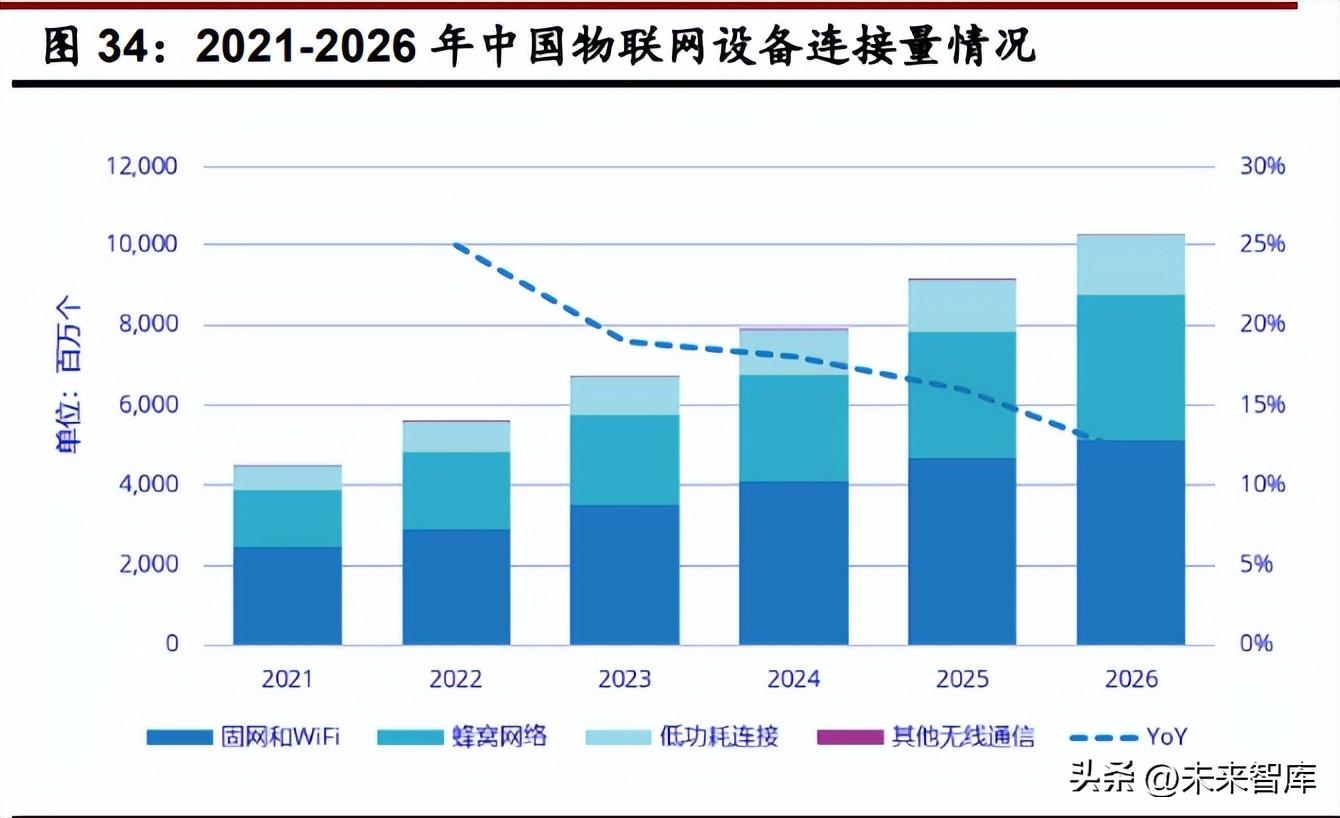 AIGC 有望成为物联网应用的重要助手,推动物联网行业快速发展。物联网可以提供大规 模的数据,能一定程度上解决 AIGC 模型训练所需的数据来源;物联网技术能够实现对物理世 界的状态数据、定位数据、行为数据等采集,在获得这些数据后,AIGC 模型能够更深入地学 习各行业具体场景知识,输出更精准的信息,为行业经营者提供参考,加速产业数字化升级的 步伐,以及简化人们与智能家居、智能硬件交互的方式。AIGC 有望成为物联网应用的重要助 手,推动物联网行业快速发展。根据 IDC 的数据,预计到 2026 年中国物联网设备连接数总量 将达到 102.5 亿个,2022-2026 复合增长率为 18%。