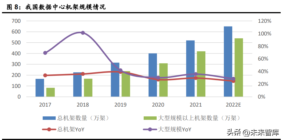 按照标准机架 2.5kW 统计,截至 2022 年年底,我国在用数据中心机架总规模超过 650 万 架,近五年 CAGR 达到 31.4%。其中,大型以上数据中心机架规模增长更快,按照标准机架 2.5kW 统计,预计 2022 年机架规模 540 万架,占比超过 80%。