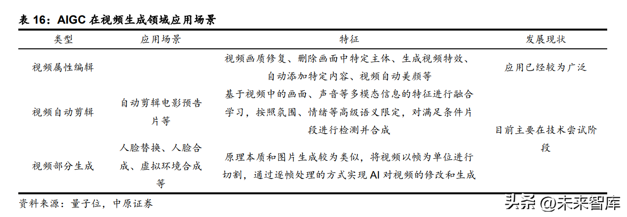 AI 技术在视频生成领域的使用主要集中在视频属性编辑、视频自动剪辑和视频部分生成 3 个领域,视频属性编辑主要在画质修复、删除特定主体、增加特定内容等方面,通过 AI 的方 式代替大量人工操作环节,目前已经实现相对广泛的应用,视频自动剪辑和视频部分生成对 AI 的智能化要求更高,因此还处于技术拓展的阶段。 虽然目前 AI 技术在视频生成领域的技术还远未达到成熟的地步,难以发挥理想中的效 果,但基于目前互联网上长视频和短视频内容数量的急剧膨胀,视频内容生成的需求将会大幅 提升,未来 AI 技术进步后视频生成有望成为 AIGC 的高潜力场景。