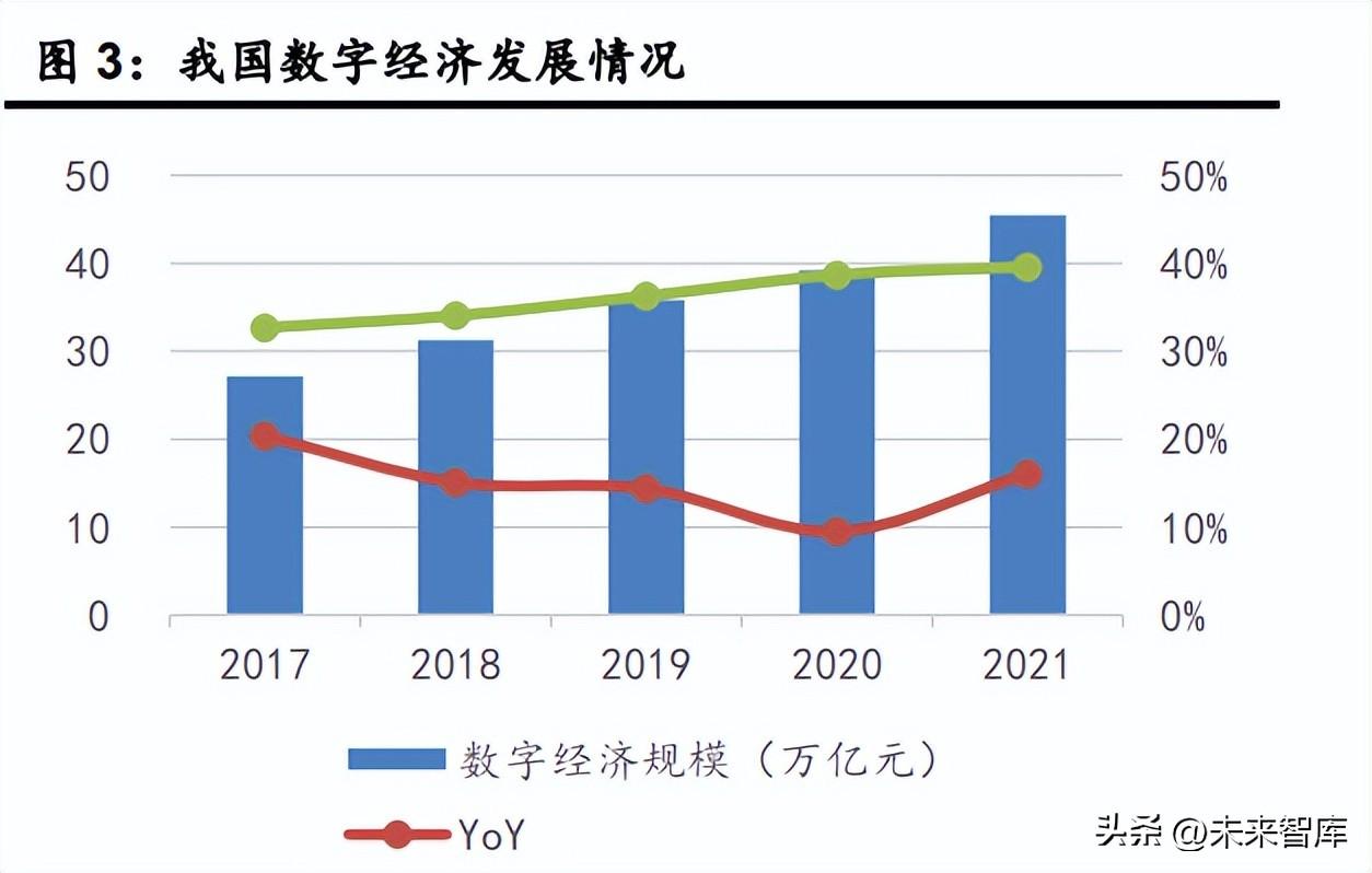 数字经济是以数字化的知识和信息作为关键生产要素,以数字技术为核心驱动力量,以 现代信息网络为重要载体,通过数字技术与实体经济深度融合,不断提高经济社会的数字 化、网络化、智能化水平,加速重构经济发展与治理模式的新型经济形态。根据《“十四五” 数字经济发展规划》,到 2025 年,数字经济核心产业增加值占国内生产总值比重达到 10%,数 据要素市场体系初步建立,产业数字化转型迈上新台阶,数字产业化水平显著提升,数字化公 共服务更加普惠均等,数字经济治理体系更加完善。《关于构建数据基础制度更好发挥数据要 素作用的意见》中明确指出数据作为新型生产要素,是数字化、网络化、智能化的基础。数据基础制度建设事关国家发展和安全大局。加快构建数据基础制度,充分发挥我国海量数据 规模和丰富应用场景优势,激活数据要素潜能,做强做优做大数字经济,增强经济发展新动 能,构筑国家竞争新优势。 数字经济包含数字产业化、产业数字化、数字化治理和数据价值化四个方面。1)数字产 业化(信息通信产业)包括电子信息制造业、电信业、软件和信息技术服务业、互联网行业 等;2)产业数字化是指传统产业应用数字技术所带来的产出增加和效率提升部分,包括工业 互联网、智能制造、车联网、平台经济等融合型新产业新模式新业态;3)数字化治理是以 “数字技术+治理”为典型特征的技管结合,包括多元治理和数字化公共服务等;4)数据价值 化包括数据采集、数据标准、数据确权、数据标注、数据定价、数据交易、数据流转、数据保 护等。
