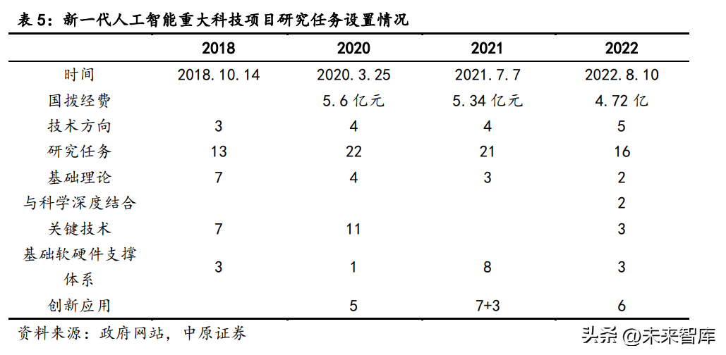 按照《国家创新驱动发展战略纲要》和国家“十三五”规划纲要部署,我国面向 2030 年部 署了一批与国家战略长远发展和人民生活紧密相关科技创新重大项目,统称为“科技创新2030—重大项目”。它与国家科技重大专项形成一个远近结合、梯次接续的系统布局。 2017 年 2 月,考虑到人工智能迅速发展的态势,科技部在已有的 15 个科技创新 2030 项 目的基础上新增“人工智能 2.0”,“重点围绕新一代人工智能基础理论、面向重大需求的核心 关键技术、智能芯片与系统三个方向展开部署”。 而后,《新一代人工智能重大科技项目实施方案》出台,在此基础上,科技部分别在 2018 年、2020 年、2021 年、2022 年出台了相关项目的申报指南,其中从经费上来看,2020 年、 2021 年披露的资金都在 5 亿以上,从研究的方向上来看,前期重点关注的是基础理论、关键 技术、基础软硬件支撑,2020 年开始拓展到了创新应用,2022 年的投入方向进一步拓展到了 与科学的深度结合。与之相结合的是,2023 年 3 月,科技部和自然基金委启动“人工智能驱 动的科学研究”专项部署工作,紧密结合数学、物理、化学、天文等基础学科关键问题,围绕 药物研发、基因研究、生物育种、新材料研发等重点领域科研需求展开,布局“人工智能驱动 的科学研究”前沿科技研发体系。