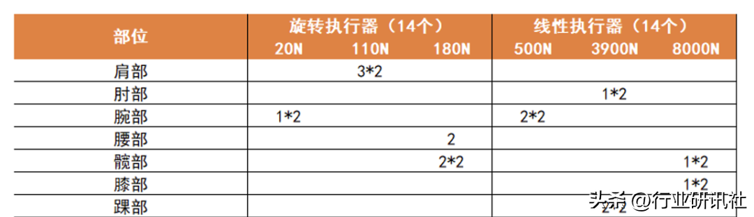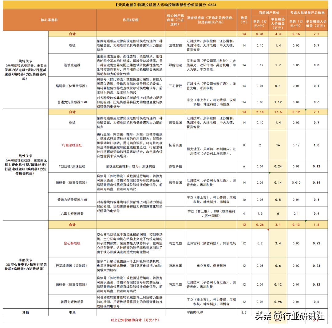 我们预计旋转关节核心零部件有电机(500*14)+谐波减速器(和绿的合资做)+编码器(100*14),线性关节核心零部件有电机(500*14)+行星丝杠/T型丝杠+编码器(拟自己做,100*14)。