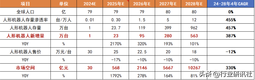 我们预计24年人形机器人销量有望达1万台,28年达563万台,24-28年CAGR=387%,28年市场空间达1万亿。往远期空间展望,按照马斯克说的人的数量和机器人的数量来比,如果做成2:1的话,全球80亿人口,人形机器人40亿,单价2万美元,则有80万亿美元空间。
