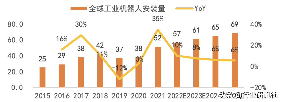 2021年全球工业机器人市场强劲反弹,市场规模为1190亿元,同比增长26%;2021年全球工业机器人安装量达52万台,同比增长35%。随着市场需求持续释放以及工业机器人的进一步普及,