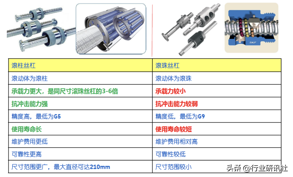 承载能力及寿命行星滚柱丝杠与滚珠丝杠的优势在于能够提供高于滚珠丝杠的额定动载和静载,螺纹滚柱替代滚珠将使负载通过众多接触线迅速释放,从而能有更高的抗冲击能力。