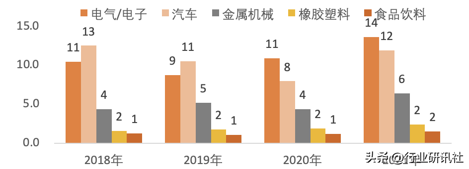 工业机器人是实现自动化生产的终端设备,下游是汽车制造业、3C行业、化工、金属加工业、食品制造等。