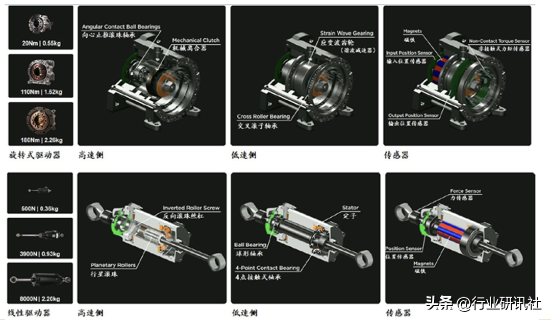行星滚柱具有承载能力强、轴向刚度大、传动效率高、使用寿命长等优点,但价格较高&海外垄断(舍弗勒目前售价在2万元/个),故我们预计或用在对承载能力要求高的下半身(8个)。目前,鼎智科技、贝斯特处于研发中,恒立液压处于扩产中。
