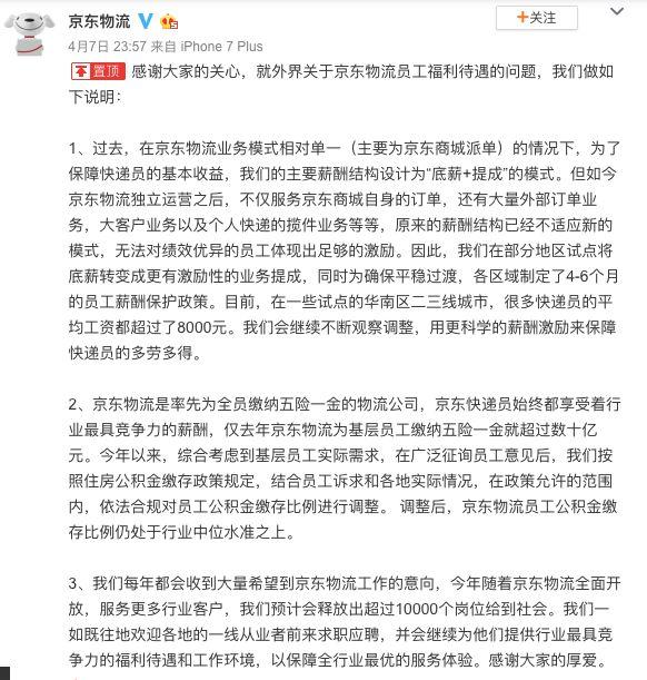 针对所爆料的取消快递员底薪、下调公积金系数的消息,京东物流在微博发文回应: