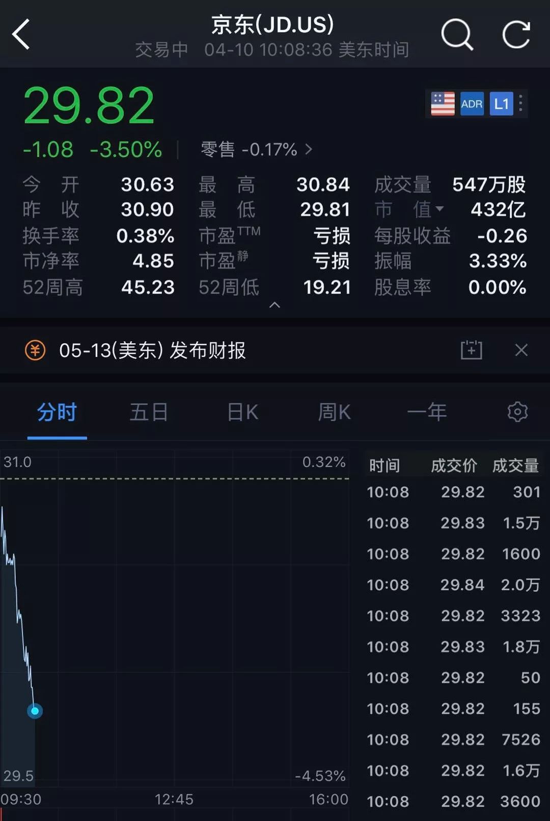 4月10日晚美股开盘后,三大股指整体走势还算平稳,陷入风波的京东股价却直线下降,截至4月10日晚10点左右,跌幅达3.5%。