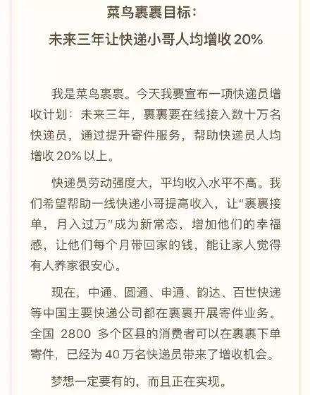 戏剧的是,这个时候,菜鸟4月9日宣布:未来三年将在线接入数十万名快递员,通过提升寄件服务,帮助快递员人均增收20%以上。菜鸟裹裹总经理李江华表示,随着快递业务量高速增长,快递员劳动强度大,平均收入水平不高。菜鸟裹裹既方便了消费者在线寄件,也可以为快递员收入带来明显增长,让他们更有幸福感、获得感,有助于快递服务水平的整体提升.
