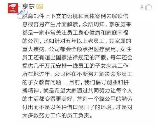 后来京东回应称,脱离邮件上下文的语境和具体案例去解读信息很容易产生片面解读。