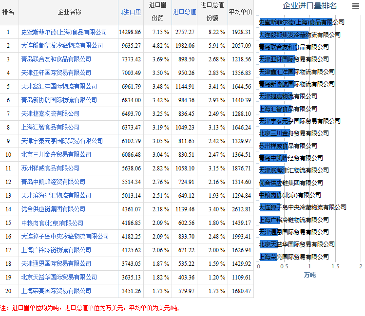 :双汇发展年报中披露其猪肉进口情况,市场一些专家就开始各种解析,但如果双汇不公布,那是违反了证券法,对股东不负责。其他大量猪肉进口可能不是上市公司,一般情况下,比较难获得其猪肉情况,比较分析某国企猪肉进口量也不少,排名也相当靠前。我们关于企业对国家和民族的担当方面,应该在道义上谴责它,你我都可以,因为它是国企。其实,类似的进口行为又岂止是猪肉,白糖、玉米、小麦、稻谷等等,由于对私营企业分配的配额较少,外加程序上的限制,近年来大幅提高的上述产品的进口,国企也是功不可没的。