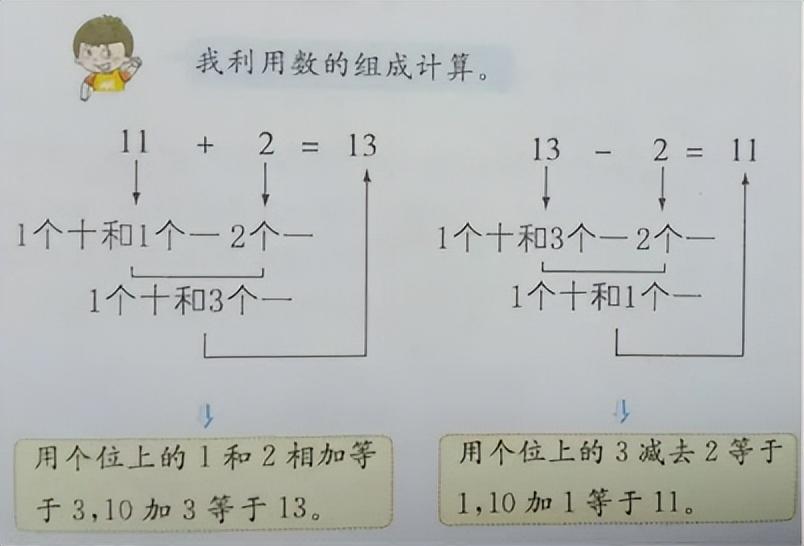 计算十几加几和相应的减法时,可以利用数的组成来计算,也可以把个位上的数相加或相减,再加整十数。