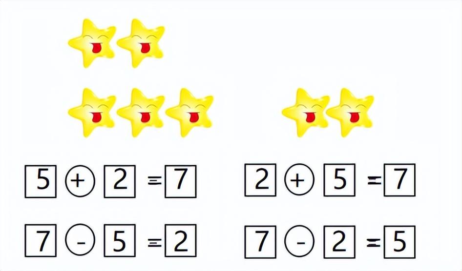 (2)一图四式:一幅图,由于观察的角度不同,通常可以写出两道加法算式和两道减法算式。如:
