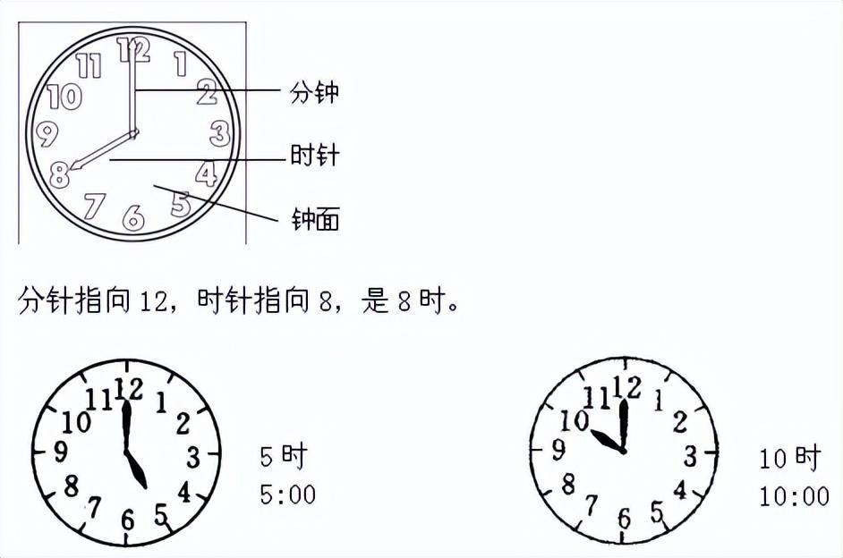 时针:钟面上又粗又短的指针叫时针。