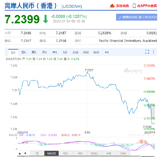 7月4日,人民币中间价报7.2046,上调111点,上一交易日中间价报7.2157,在岸人民币上一交易日收报7.2466。离岸人民币涨破7.24关口,日内升值近100点。