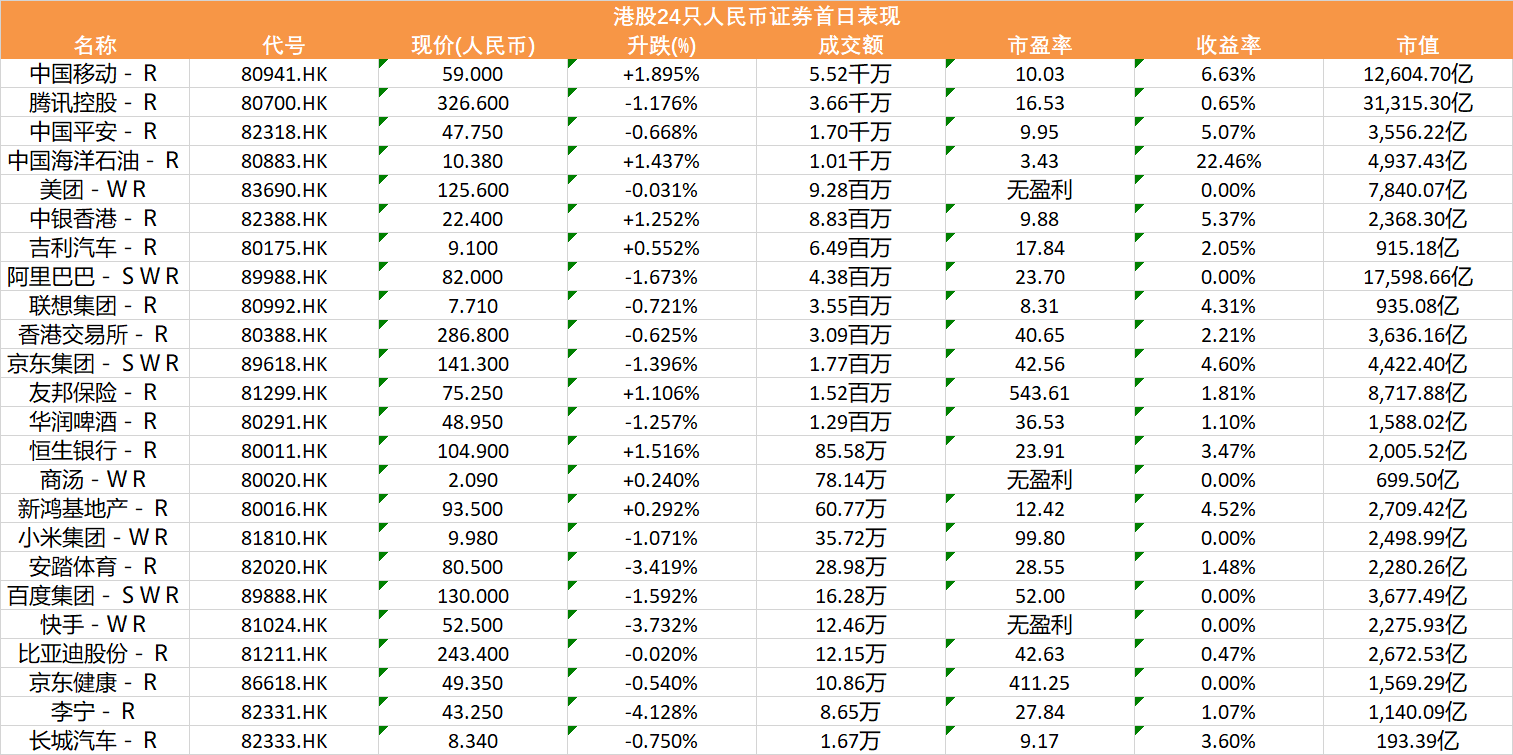 人民币买港股今天迈出重要一步!成交1.63亿成就破冰之旅,双柜台24只股票均为大型上市公司-中国外股票资讯