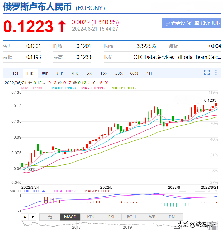 对于今天要聊的俄罗斯卢布,自从上一次打了漂亮翻身仗之后,一直延续震荡上升态势,其升值势头强劲,兑换美元、人民币汇率一路攀升,让无数人感到惊讶不已,毕竟这在历史属于较为罕见的现象。目前人民币兑卢布汇率8.35,卢布飙升至近7年新高,如此涨势令俄央行担忧,