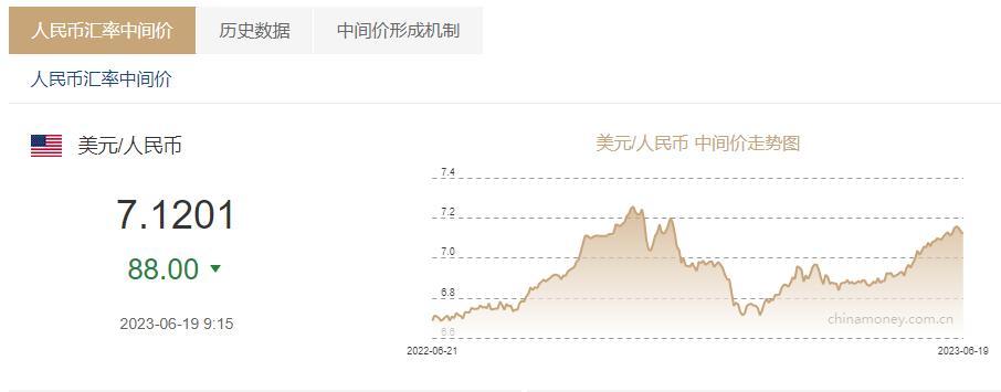 金融界6月19日消息 人民币兑美元中间价上调88个基点至7.1201。