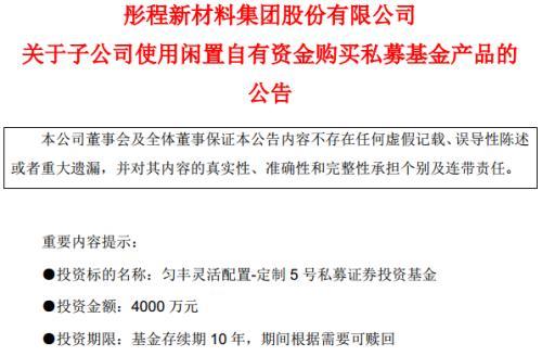 除了展鹏科技,11月还有一家上市公司也公告认购证券私募基金产品的情况。11月1日,彤程新材公告称,近日下属子公司上海彤程化工有限公司与北京匀丰资产管理有限公司、中信证券签署合同,出资4000万元购买匀丰灵活配置-定制5号私募证券投资基金。