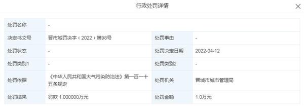 中国网财经梳理发现,今年4月12日,该公司因违反《中华人民共和国大气污染防治法》第一百一十五条规定,被晋城市城市管理局罚款1万元。
