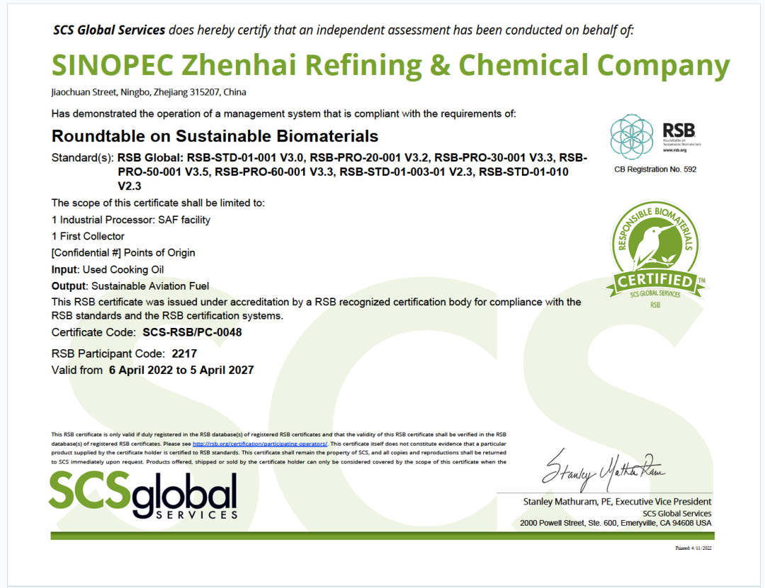 近日,镇海炼化油脂加氢(HEFA)路线生物航煤产品,通过可持续生物材料圆桌会议(Roundtable on Sustainable Biomaterials)认证,认证表明,镇海炼化生物航煤装置原料、生产工艺及产品均符合RSB生物燃料可持续发展的基本原则与标准,获得全球可持续生物材料的应用认可。镇海炼化成为