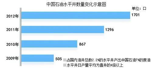 这个图有点老。这是中石油每年的水平井钻井数,包括在国外钻的水平井。2012年的1701口水平井包括国外的350口,国内1351口。现在很多油田一年打的水平井就比十年前全国打的水平井还多。