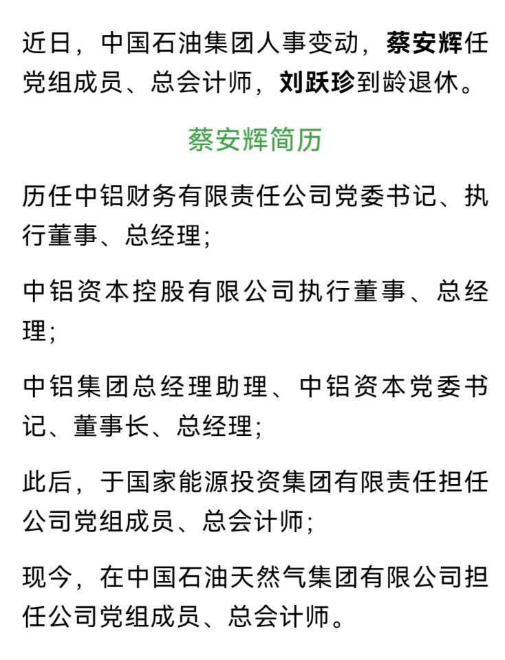 中国石油集团人事变动 蔡安辉任党组成员总会计师 刘跃珍退休