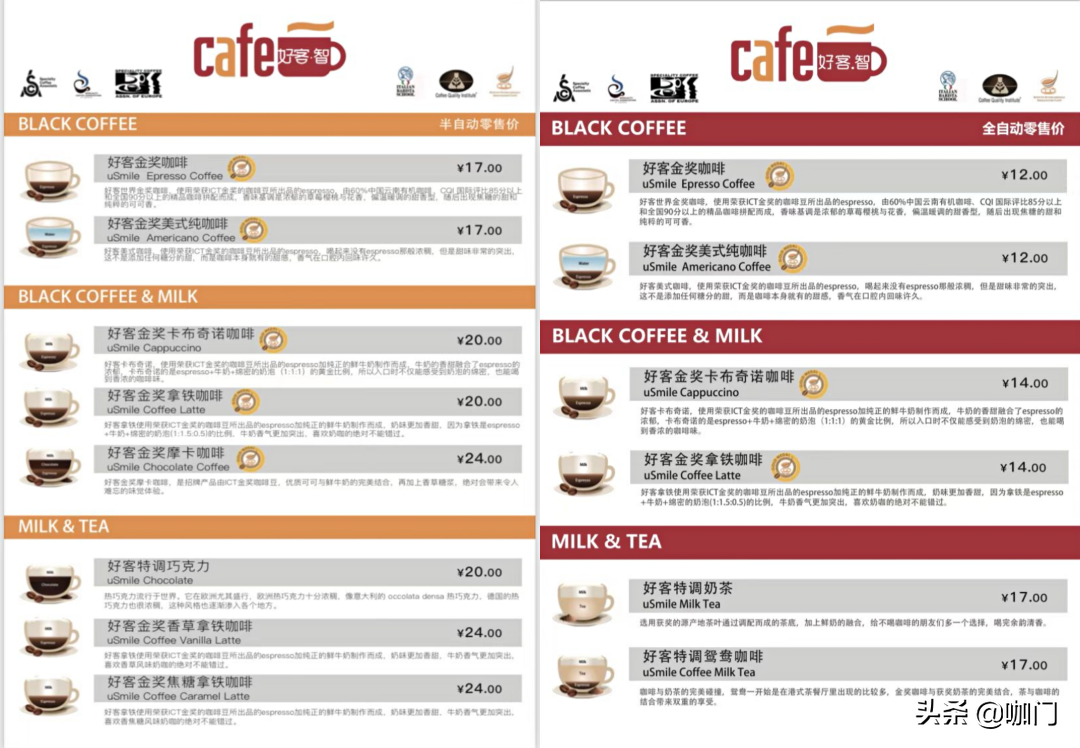从菜单上看,好客的现磨咖啡分两个产品线:
