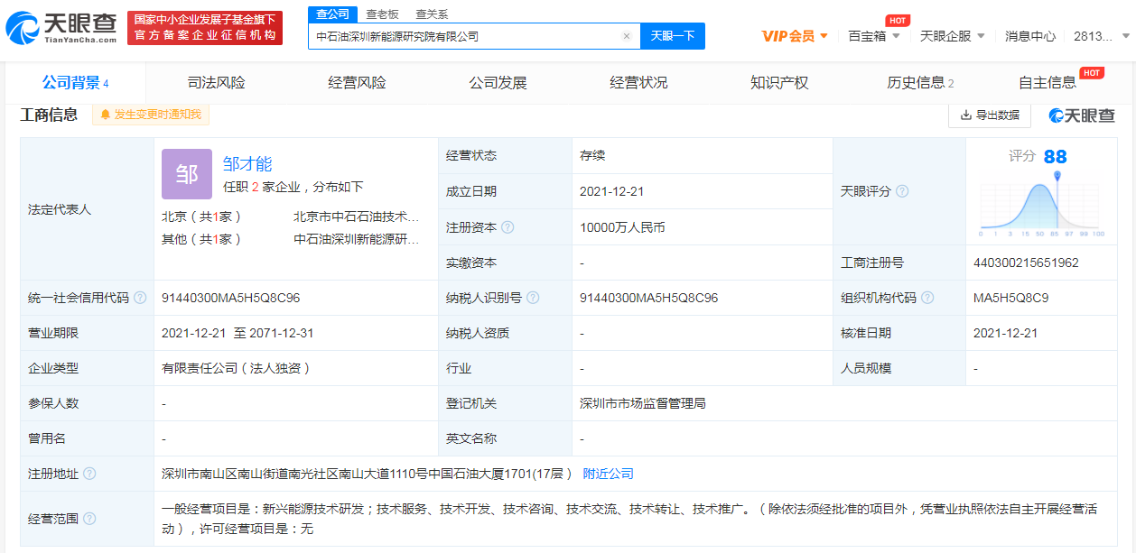 鞭牛士 12月22日消息,据天眼查App显示,昨日,中石油深圳新能源研究院有限公司成立,注册资本1亿人民币,法定代表人为邹才能,经营范围含新兴能源技术研发;技术服务、开发、咨询、推广等。股东信息显示,该公司由中国石油天然气股份有限公司全资持股。