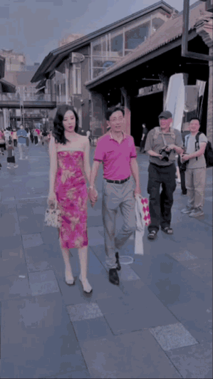 他们拉手走路的过程,因为董女士身材太出众,大概有多个镜头对着他们,从现场视频来看,董女士还礼貌地与一个拍摄者打招呼!