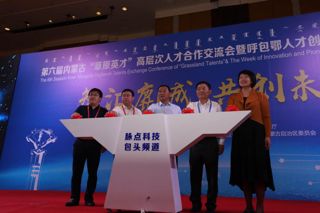 包头市政府副市长武二斌、自治区党委组织部人才处处长张秦、自治区人力资源和社会保障厅人才开发处处长云霞、包头市科技局局长方立与中科创享集团兼脉点科技董事长任凤银共同启动平台上线。