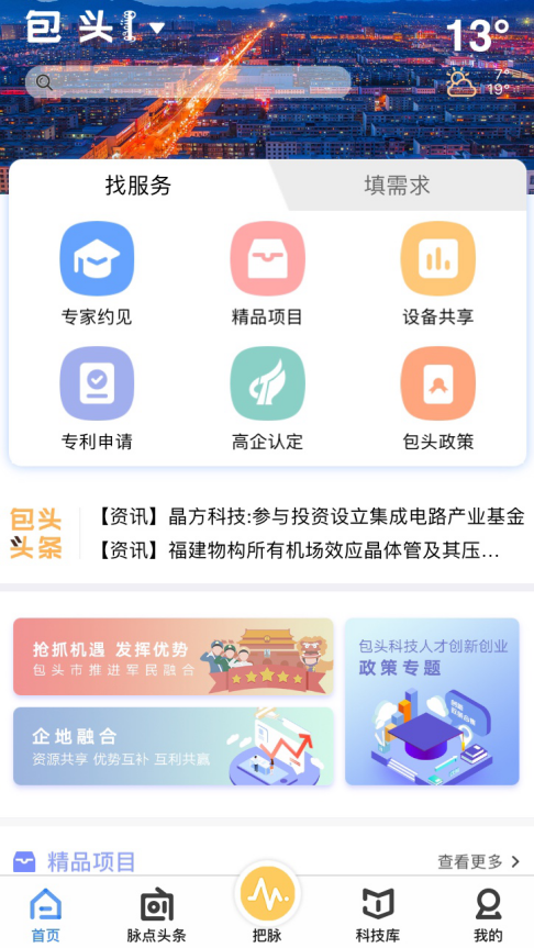 包头(企地融合、军民融合)科技大数据服务平台是北京脉点科技有限公司在包头市科技局支持下,以手机端应用产品为载体,依托中国科学院等国内外顶尖科技资源和平台卓越的线下运营能力,为包头市企业打造的科技创新一站式综合服务平台。