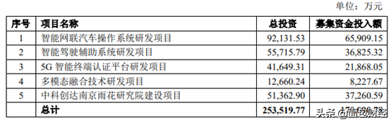 募集资金主要用于智能网联汽车操作系统研发、智能驾驶辅助系统研发、5G智能终端认证平台研发、多模态融合技术研发及中科创达南京雨花研究院建设等5个项目。