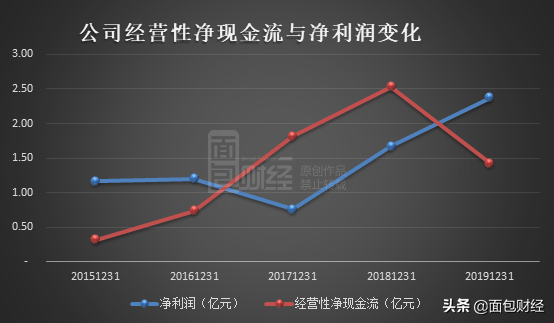 2019年,公司经营性净现金流1.42亿元,同比下滑43.86%,较年度净利润少0.95亿。